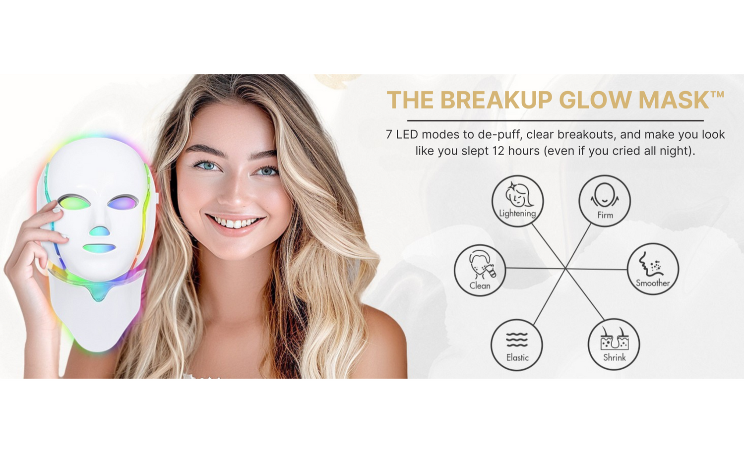 The Breakup Glow Mask™ uses 7 LED light modes to de-puff, clear breakouts, and revive tired skin. Just 15 minutes a day and your friends won’t even realize you’ve been crying over him — they’ll think you’ve been living at the spa.